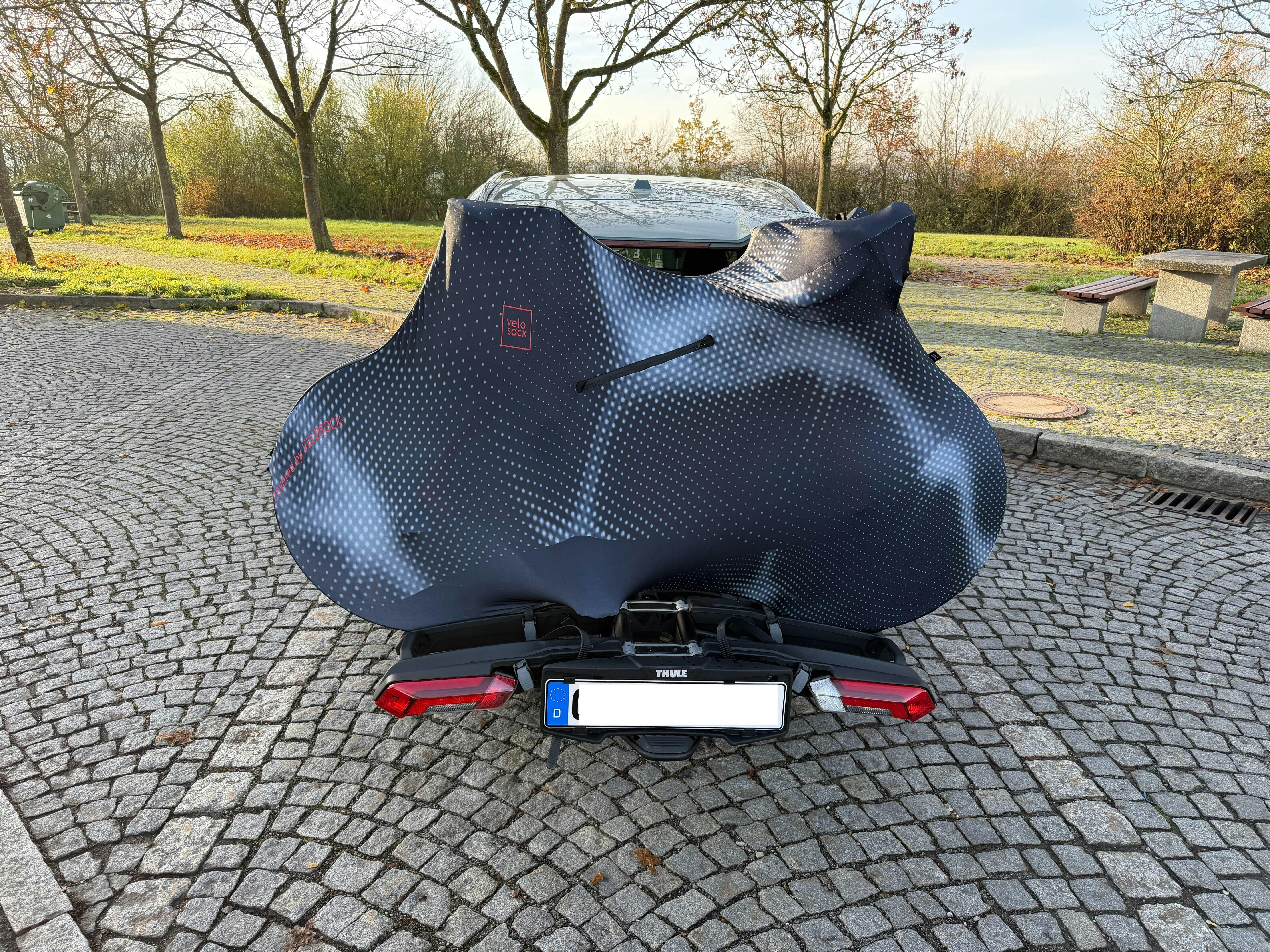 The VELOSOCK Bike Cover for car racks is specifically designed for bike transportation on rear car bike racks, as well as for long-term storage indoors, in a garage or on a closed balcony.