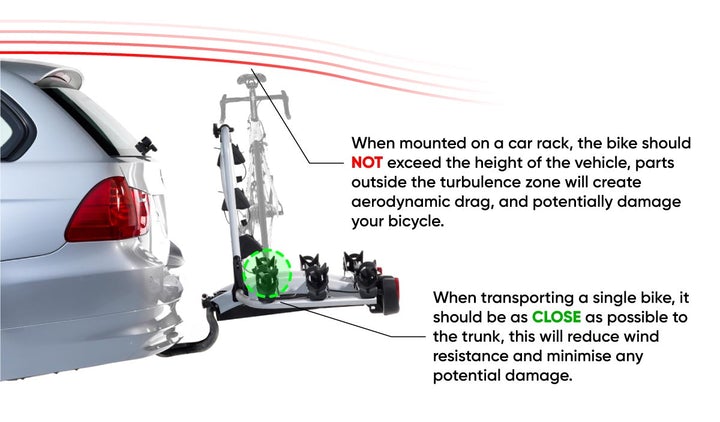 Some car bike racks come with a maximum speed warning which shouldn’t be exceeded. Aerodynamic drag increases with speed, and exceeding the speed rating could exert too much force onto the bike cover. If possible, use a lower speed limit (-20 km/h) than is allowed for your bike rack (see your bike rack instructions). If your Bike Cover for car racks is made of the waterproof fabric, please note that the maximum authorized speed limit is 90 kph/56 mph and wind speed not exceeding 15 kph/9 mph. The vehicle’s speed must always be adjusted to the load being carried and the current driving conditions, such as the road type, road quality, wind conditions, traffic intensity and applicable speed limits. Also, the breathable and water-repellent fabric of our Bike Cover for car racks (except the waterproof fabric) allows it to dry fast in case you've caught the rain and creates less wind resistance during transportation. These are all important aspects to consider when transporting your bike.